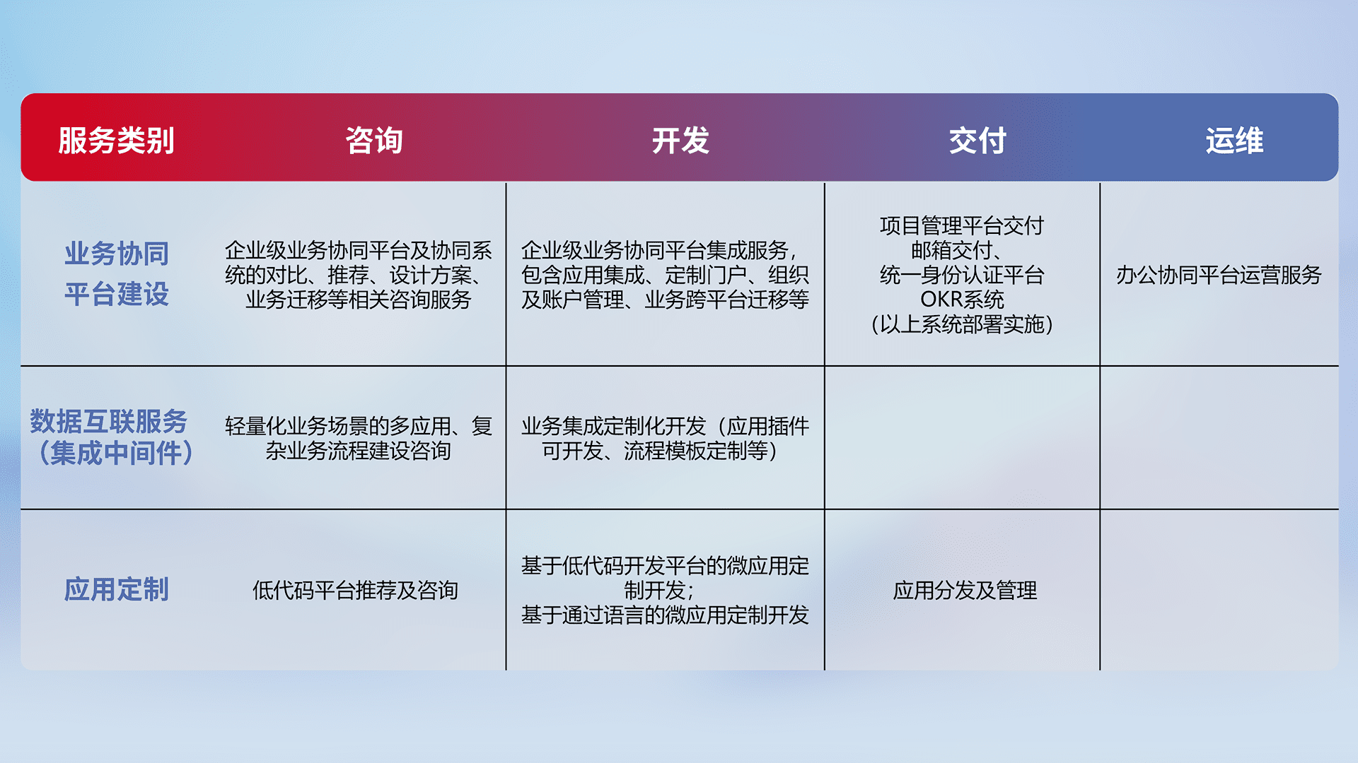 针对钉钉、、、、企微、、IDaas等平台级产品提供产品的规划、、、方案、、、交付、、、、定制化开发等服务,,,实现如统一协同办公、、、、智能客户服务、、、混合会议管理、、、智能数据查询、、等业务场景,,,实现数字化转型。。。