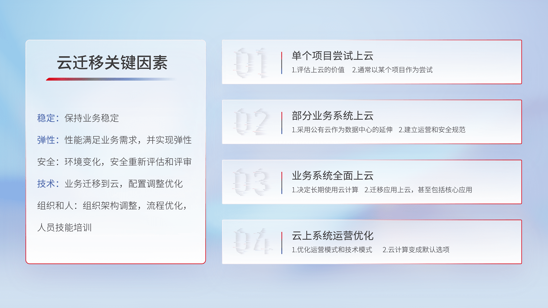 结合实际业务,,,,从规划设计、、、、云平台选型、、云原生改造、、、、数据迁移、、集成交付,,,,迁移全过程为客户识别最佳上云路径,,做好风险识别管理,,设计网络架构、、身份权限、、安全审计合规、、、、操作审计、、日志审计、、监控告警策略、、、多站点容灾设计等,,,对云上基础设施进行整体规划,,,,提升IT治理水平,,,,以满足弹性、、、、高可用、、、、高性能的需求。。。。