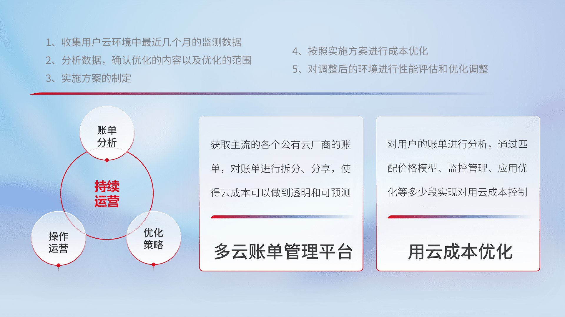 通过灵活运用多种自动化迁移工具,,,,帮助企业用户实现业务和数据高效 、、、稳定的上云迁移和云上迁移,,,,采用自研多云纳管平台,,,以中立管理模式,,,解决多组织、、、多云、、多运维厂商的复杂关系的管理,,,保证多云平台资源配置的一致性,,实时掌控云资源运行数据,,运用智能化工具分析云资源多云平台的管理服务,,,,透明化管理成本支出,,用云成本可预测、、、用云费用可优化、、、、云资源配额有据可依。。。。